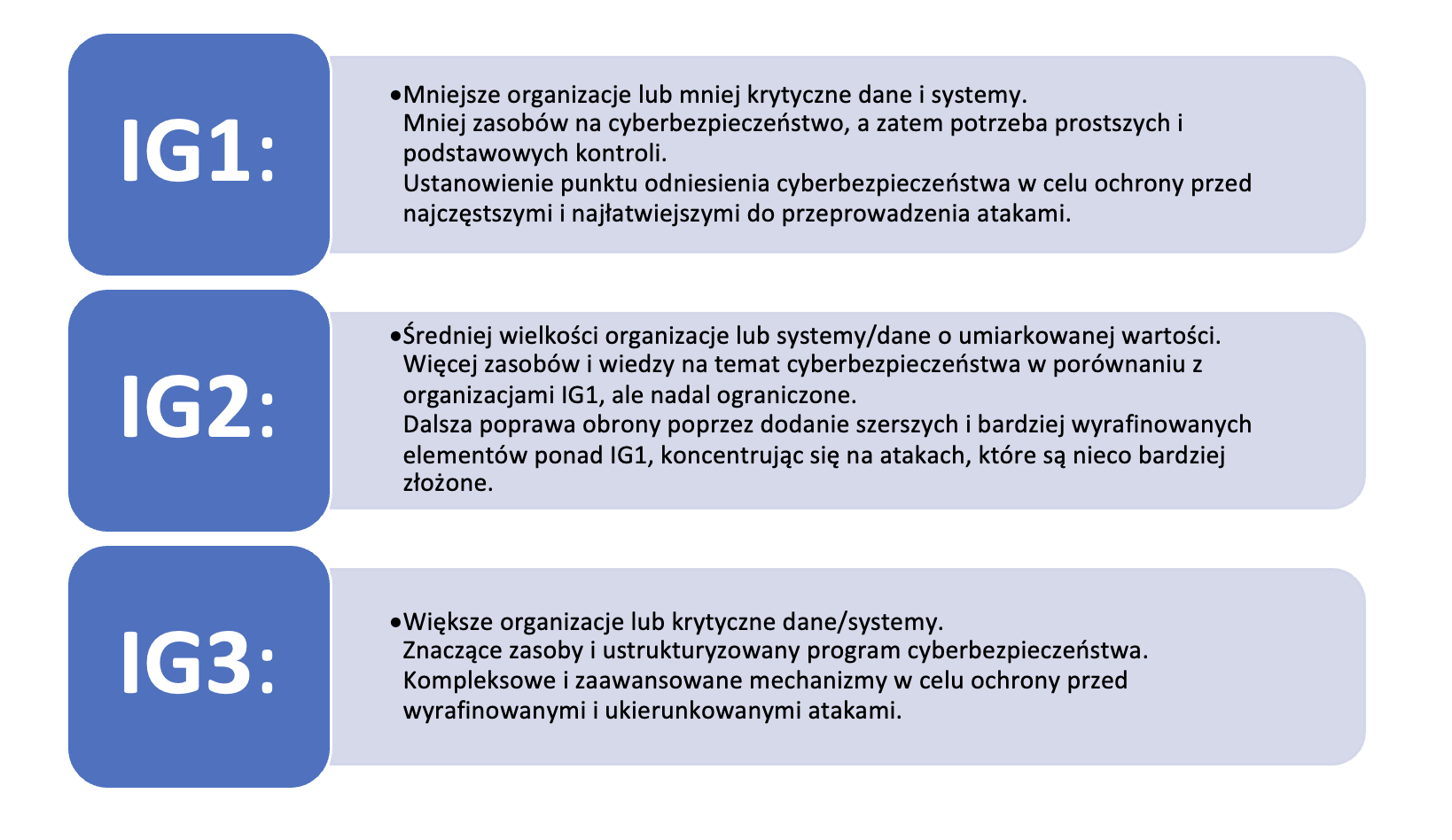 Oznaczenia IG1, IG2 i IG3 (IG: Implementation Group) odnoszą się do grup wdrożeniowych, które są podzbiorami kontrolek CIS, mających na celu zapewnienie właściwej ścieżki stopniowej poprawy stanu cyberbezpieczeństwa organizacji.