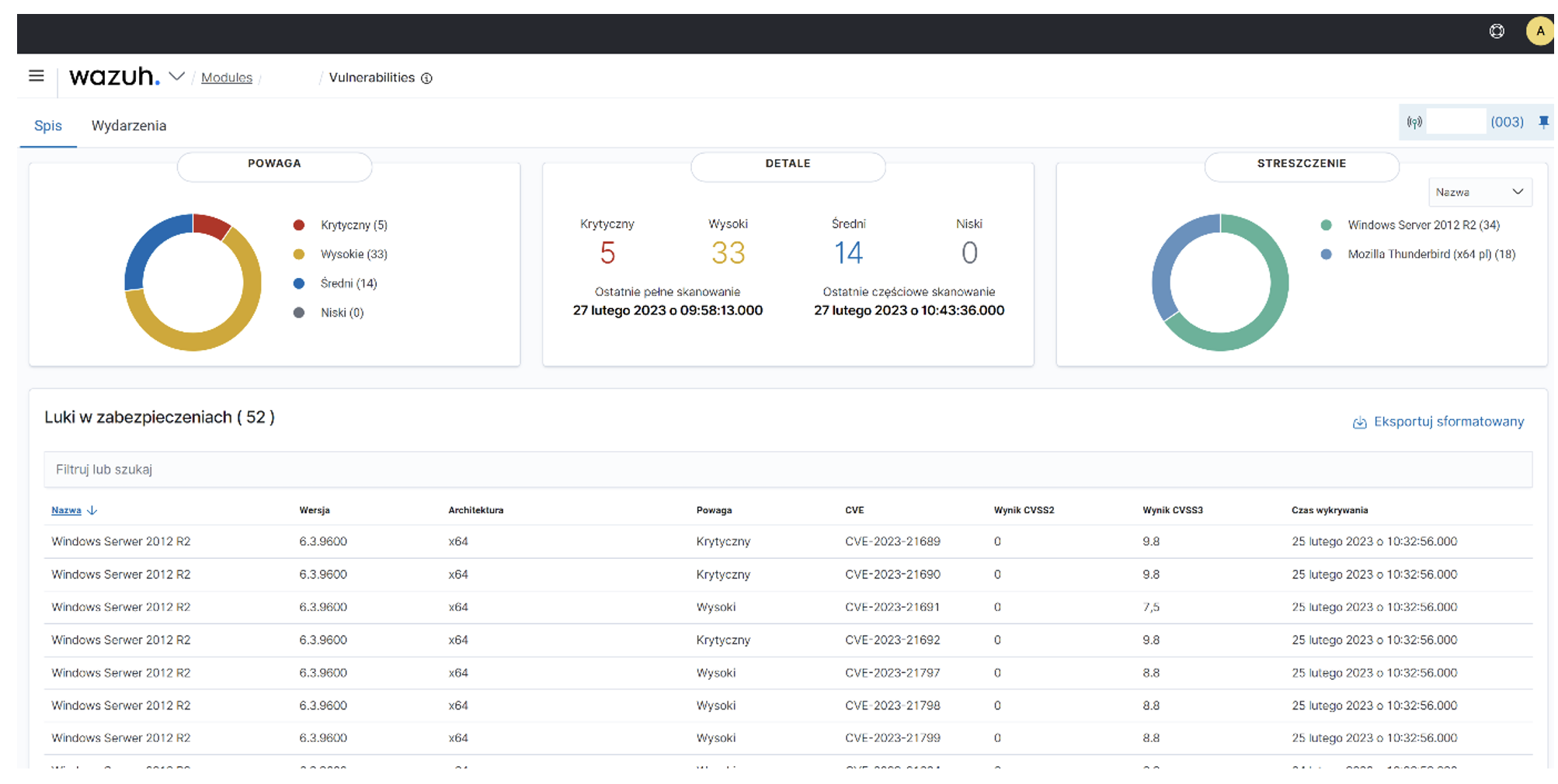 W interfejsie użytkownika Wazuh można zobaczyć wszystkie wykryte luki.